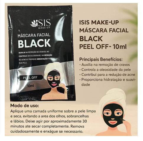 A Máscara Facial Black da ISIS MAKE-UP foi desenvolvida para auxiliar na remoção de cravos, ajudar no controle da oleosidade e contribuir para a redução da acne, enquanto promove hidratação para a sua pele. Com ação “peel off”, esta máscara forma uma película que facilita a retirada das impurezas, deixando a pele mais limpa, suave e renovada.